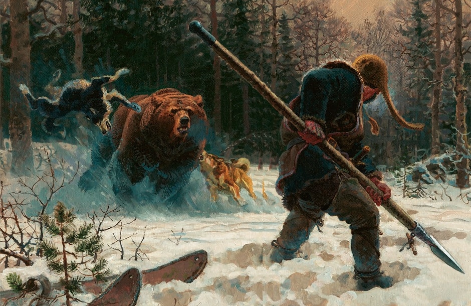 В конце XIX века гостей олонецкого губернатора Григория Григорьева «встречало» чучело медведя, установленное в саду. В его лапах находился поднос со штофом водки и стопками. И каждый вновь прибывший угощался столь необычным образом. История умалчивает, как именно был добыт конкретно этот медведь. Но мы точно знаем, что в XVIII-XIX веках в Карелии охота на этого опасного хищника не была чем-то из ряда вон. Более того, на медведя нередко ходили и в одиночку — с одной лишь рогатиной. О том, насколько опасен был этот противник, говорит хотя бы тот факт, что даже слово «медведь» старались не произносить вслух, чтобы не накликать беды. Использовали различные экивоки и прозвища: хозяин, овсяник, звирь (зверь) или попросту — он. Славяне издревле, впрочем, как и многие другие народы, жившие там, где обитали медведи, почитали это животное, считая его «почти человеком». Во многих отдаленных сельских поселениях и по сей день бытует легенда о злом колдуне, превратившем человека в зверя. Неудивитель