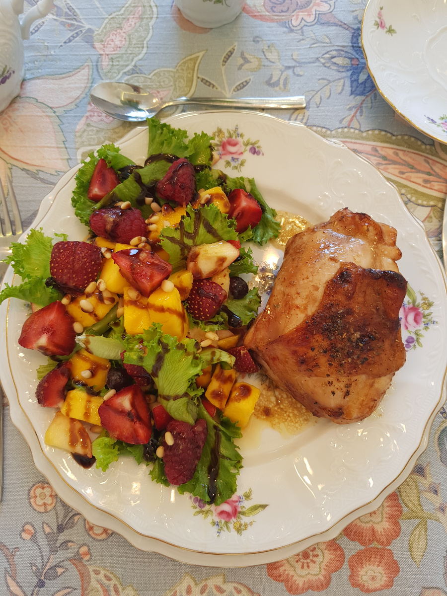 Доброе утро, дорогие друзья! Поздравляю всех строителей с профессиональным праздником и по этому поводу предлагаю рецепт праздничного завтрака! Для приготовления нам понадобятся: куриные бедра, замаринованные в соусе терияки, 2 кг, манго 1 штука, нектарины 2 штуки, виноград без косточек 100 грамм, клубника 300 грамм, малина, 1/2 апельсина, 50 грамм кедровых орешков, 1 столовая ложка оливкового масла, 1/4 чайной ложки приправы «Итальянские травы», листья салата, бальзамический соус. Приготовление: куриные бедра смешать со 100 граммами соуса терияки. И мариновать в течение 24 часов в холодильнике. Выложить на противень на пергамент и запекать на режиме «Гриль» большой площадью в течение 40 минут. Через 20 минут после начала приготовления мясо перевернуть. Удалить косточки у нектарин и нарезать их кубиком. Манго очистить, удалить косточку и тоже нарезать кубиком. Добавить виноград. Выжать сок из половинки апельсина, смешать с оливковым маслом и приправой. Полить заправкой салат и перемеш