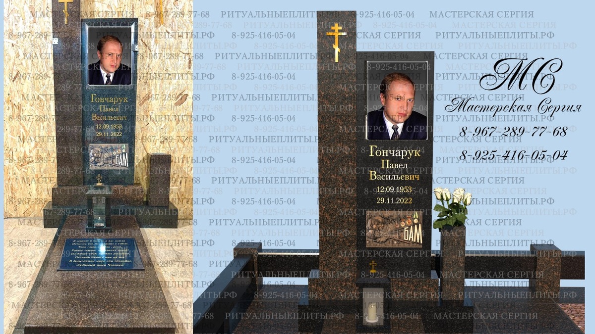 Мастерская Сергия изготовила красивый долговечный памятник в комбинации двух уникальных сортов гранита - черного и шоколадного, который объединяет в себе красоту и выразительность, изделие отличается высокой прочностью и устойчивостью к природным воздействиям, данные сорта считаются одними из самых долговечных и твердых, черный насыщенный камень создает прекрасный контраст с шоколадным и гармонично дополняют друг друга, памятник не требует специального ухода, полировка со всех сторон красиво блестит на солнце и придает гранитному сооружению особую шарм и красоту. Надгробие состоит из двух строгих частей, объединенных в единую композицию и основу, центральной частью является прямоугольный памятник, который занимает большую часть, четкие и прямые линии создают по-настоящему величественный и динамичный образ, портрет на Итальянском керамограните известен своей превосходной прочностью, устойчивостью к влаге и коррозии, не имеет аналогов и создает яркое и живое изображение, портрет органично вписывается в общий вид памятника и сохраняет светлую память о любимом человеке на долгие годы. Ниже расположены эксклюзивные накладные надписи из нержавеющей стали с золотистым покрытием, каждая буква отполирована до зеркального блеска и покрашена защитным золотистым покрытием, на натуральном камне смотрится особенно уникально и хорошо просматривается с дальнего расстояния, объемный строгий шрифт придает памятнику неповторимый индивидуальный вид, каждая буква имеет два штыря, по специальному шаблону вымеряется и засверливается и уже непосредственно, клеится на специальный качественный клей.