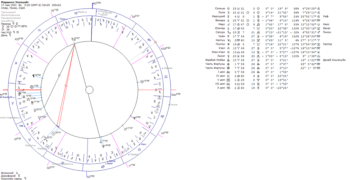 И если у Эпплуайта из двух вредителей сопровождающая планета это ретро-Сатурн, у Лавея это Марс, а в ночной карте Марс в достоинствах, да в I доме так не вредит и в депрессию не погружает. Наоборот, дает силу и бодрость на реализацию вполне мирских стремлений. И Луна как светило секты у него наааамного лучше, чем у Эпплуайта.