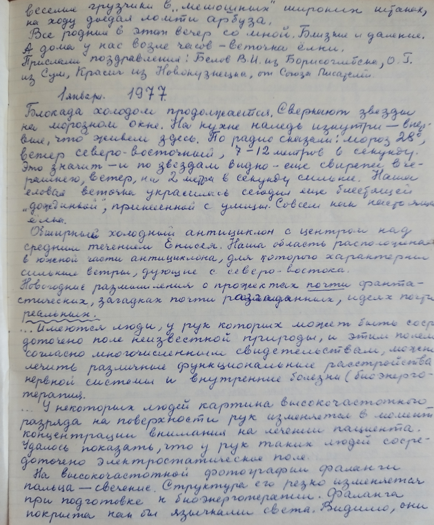 1 января 1977 «…Блокада холодом продолжается…Имеются люди, у рук которых может быть сосредоточено поле неизвестной природы, и этим полем…можно лечить разные функциональные расстройства нервной системы и внутренние болезни (биоэнерготерапия)…У некоторых людей картина высокочастотного разряда на поверхности рук изменяется в момент концентрации внимания на лечении пациента…На высокочастотной фотографии фаланги пальца - свечение. Структура его резко изменяется при подготовке к биоэнерготерапии. Фаланга покрыта как бы язычками света. Видимо, они тянутся к пациенту, к тому, на кого нужно воздействовать. У меня перед глазами ярко встает картина Репина «Воскрешение дочери Иаира»…я всегда поражалась тем, как Репин написал Христа: в его лице…выражение врача-психиатра или медиума. Такое выражение я видела у знаменитого в 30-е годы в Саратове врача Подъяпольского…Это был психиатр. Он принимал в особой клинике, где были и другие врачи – его ученики, например, Фухторович…Никаких выводов я из этого