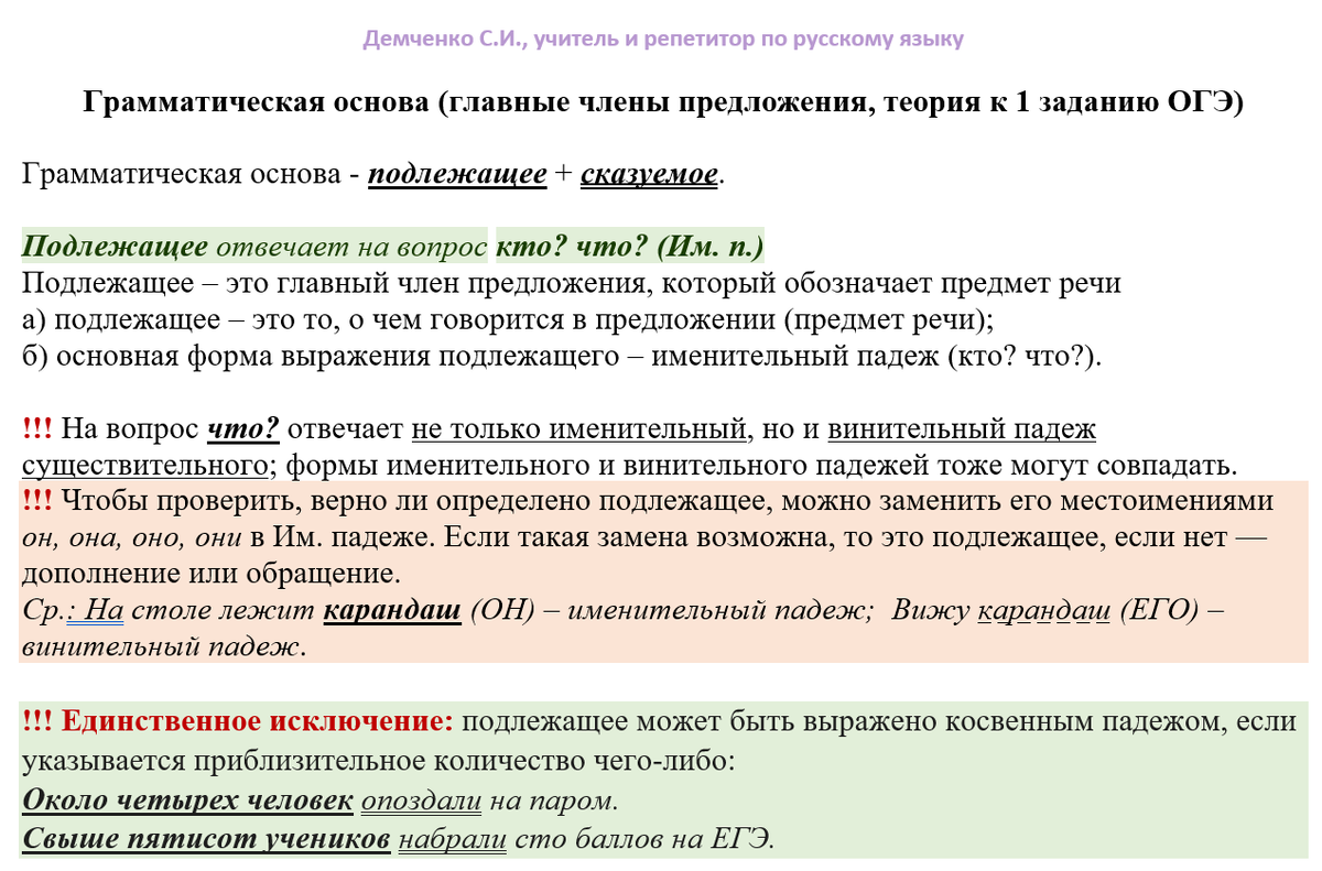 ПОДЛЕЖАЩЕЕ - один из главных членов предложения (теория к 1-2 заданиям ОГЭ)