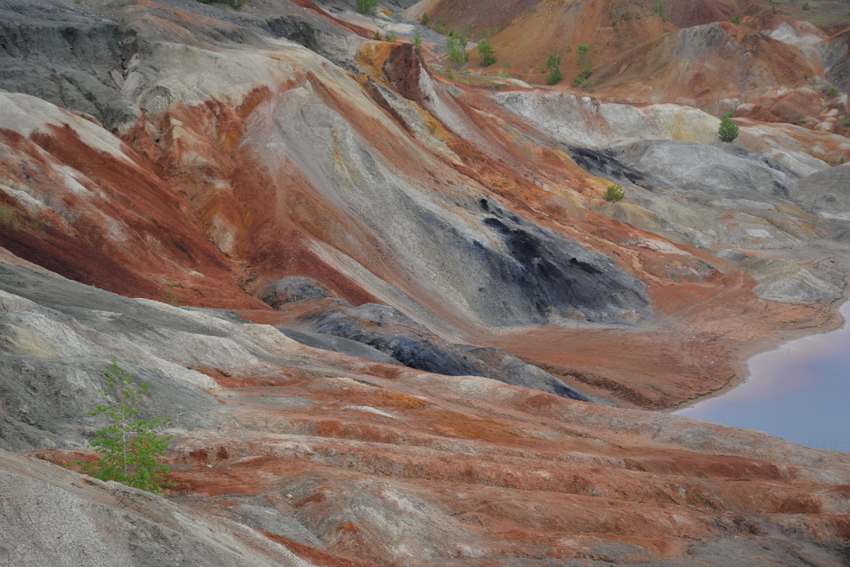 И пейзаж кое-что напоминает, верно? Очень похоже на тульские Кондуки, они же Романовские карьеры. Только расцветки иные. Цвет глины зависит от того, какие примеси содержатся в основном веществе (каолинит): это кварцевый песок, пирит, марказит, сферосидерит, слюда и др. Соответственно, в озерцах растворена половина таблицы Менделеева, и купаться в них запрещено. Да что купаться?.. К ним луч