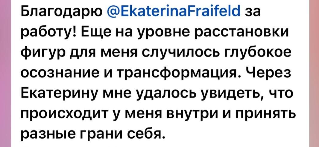 Одна из моих клиентов, Дарья, пришла ко мне с проблемой в личной жизни. В процессе работы мы выявили глубинные причины, связанные с отношениями в семье. Благодаря системным расстановкам Дарья смогла осознать свои внутренние конфликты и найти пути к их разрешению. Уже после диагностической сессии был потрясающий результат. а уже на следующий день от Дарьи пришло вот такое сообщение: дальше мы пошли в терапию с запросом ее взаимоотношения с отцом, в ходе расстановочной сессии Дарья рассказала что совсем не знала своего отца, что он погиб когда была маленькая и мама ей не рассказывала о нем ничего, мы провели сессию, и вот какое сообщение пришло после: она приняла своего папу, его род, и наполнилась, что будет дальше я расскажу по ходу трансформаций Дарьи...