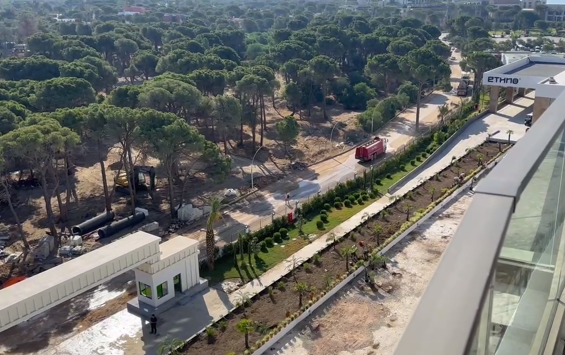 Вид с балкона открывается далеко не 5-звездочный: снующие туда-сюда грузовики, цементная пыль, неозелененная территория, сложенные на газонах стройматериалы. Во втором видео один из отдыхающих стирает рукой строительную пыль со стола в номере.
