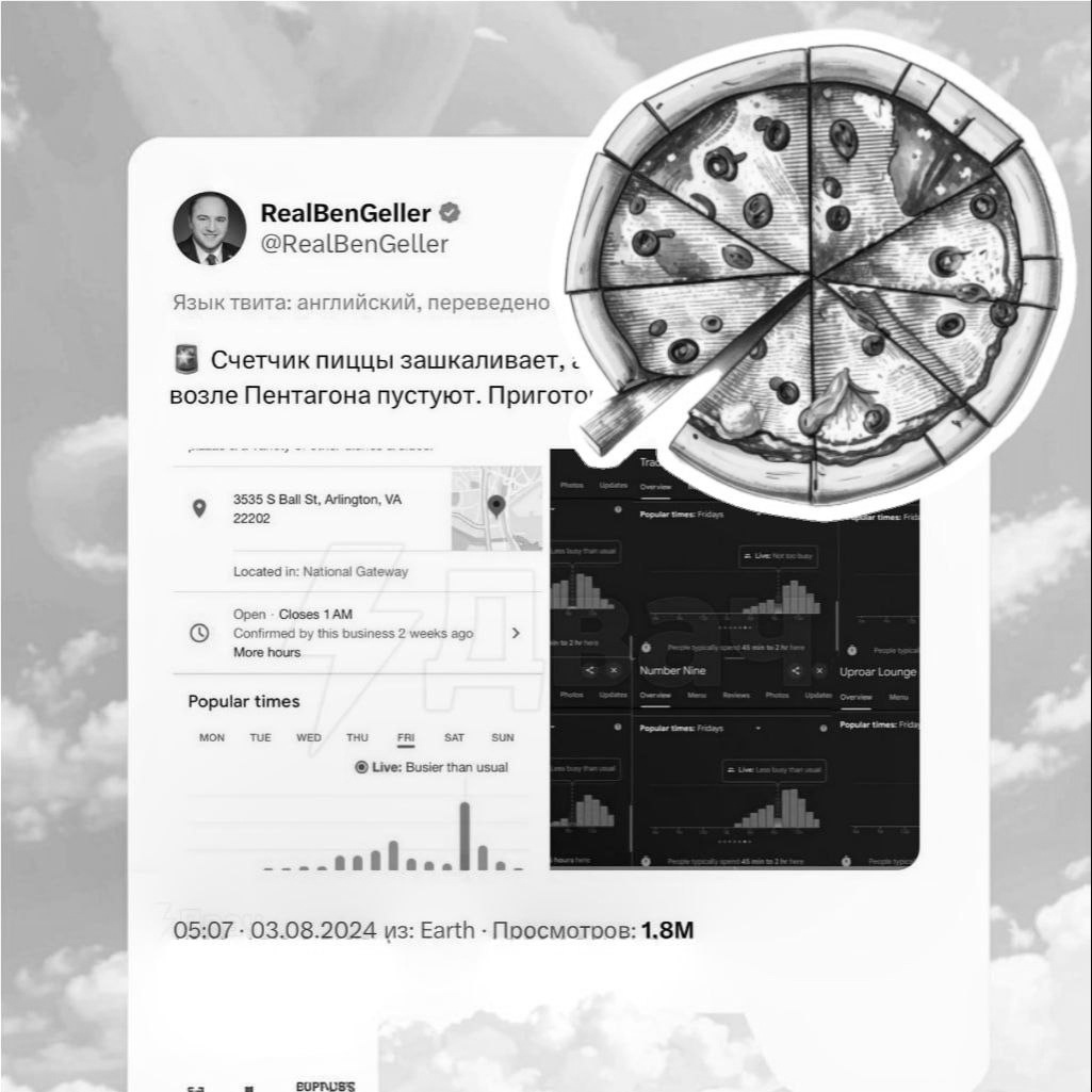 Недавно в соцсети X (бывший Twitter) стали обсуждать необычное явление: резкий рост заказов пиццы с доставкой в районе Пентагона вечером в пятницу. При этом местные гей-бары* оказались практически пустыми. Для тех, кто не в курсе, существует старый метод прогнозирования международных конфликтов, основанный на количестве заказов пиццы из пиццерий рядом с Пентагоном. Это связано с тем, что сотрудники Министерства обороны США часто остаются на работе допоздна и заказывают еду в офис.