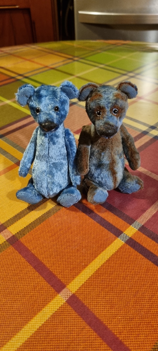 Добрый день. Нарыла я как-то в своём любимом медвежьем магазине огромный кусок винтажного голубого плюша. Он был так хорош, что я взяла весь огромный кусок. Забегая вперед, скажу, что из него уже сшиты два маленьких, два курупненьких медведя и ещё на парочку средненьких хватит. Плюш отлично ведёт себя при пошиве, не лезет, прекрасно набивается, не растягиваясь, как не надо, а растягиваясь, как надо) Два медведя, первыми сшитые из этого плюша. Один уже покрашен, второй а-ля - натурель. Но и он попал под мою кисточку. Мне очень понравилось сочетание коричневого с голубым, получились забавные мишки, эта серия у меня проходит под названием Дор-блю. Потом я шила из этого плюша медведей значительно больше этих и они тоже вышли отлично, о них напишу отдельно.