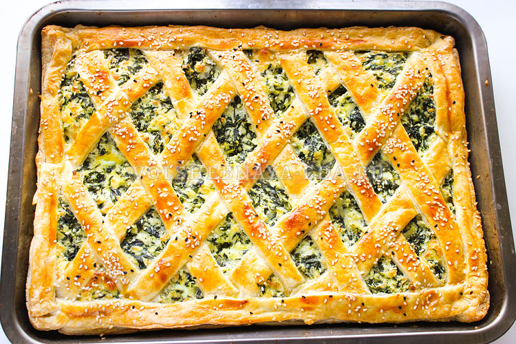 Очень простой и в то же время нарядный пирог из слоеного теста. Начинка — сыр рикотта и моцарелла, с добавлением шпината. В рецепте используется готовое слоеное тесто, так что вам не придется тратить время на замес. Достаточно приготовить начинку, красиво всё оформить и ждать, пока испечется. Полезные советы: Для начинки нарезать лук мелкими кубиками, шпинат нарубить произвольно (у меня домашний, предварительно бланшированный и замороженный). В сковороду влить немного растительного масла, быстро обжарить лук вместе со шпинатом. Остудить, можно не полностью, до теплого состояния. Соединить поджарку, рикотту и моцареллу (натереть на крупной терке), сырое яйцо, посолить и поперчить по вкусу. Тщательно размешать — удобно это делать вилкой. Слоеное бездрожжевое тесто заранее разморозить. У меня тесто порционное, всего три пласта (два пришлось соединить для основы пирога, а третий — использовать для украшения), общий вес 650 грамм. Тесто раскатать под диаметр противня для выпечки с небольшим