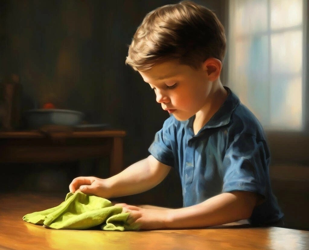 Ребенок вытирает.