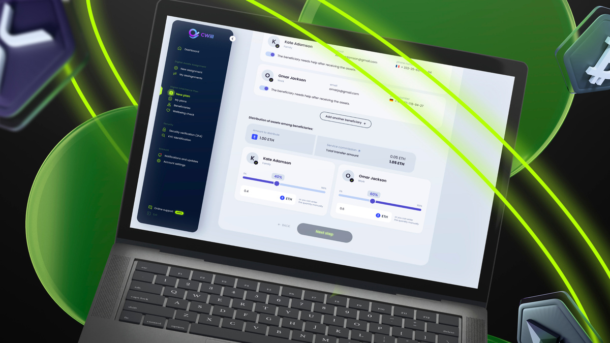 Разработали личный кабинет уникальной платформы CWILL для оформления и менеджмента завещаний на цифровые активы, выполнения отложенных криптовалютных платежей и конвертации крипты в фиат с мгновенным выводом кэша в любой точке мира. Сервис создает понятную и безопасную экосистему для управления финансовыми онлайн активами, предоставляя юзерам возможность самостоятельно и гибко определять судьбу своего цифрового наследия как при жизни, так и после смерти.
