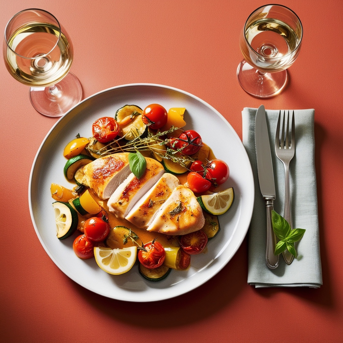 Представьте: за окном догорает закат, а на вашей кухне рождается маленькое кулинарное чудо. Сегодня мы создадим не просто ужин, а настоящую прелюдию к волшебному вечеру. Готовы? Тогда начнем наш танец у плиты! Наше блюдо - "Медовая курица с лавандой и тимьяном на подушке из сочных овощей". Звучит изысканно? Не волнуйтесь, это проще, чем кажется! Вам понадобится: Куриные грудки - 2 шт. Мед - 2 ст. ложки Лавандовый мед - 1 ст. ложка (если нет, замените обычным) Свежий тимьян - несколько веточек Сушеная лаванда - 1 ч. ложка Лимон - 1 шт. Цукини - 1 шт. Болгарский перец - 1 шт. Черри помидоры – горсть Базилик зеленый- пучок Сухое белое вино – 200- 300 мл (и еще немного для шеф-повара!) Оливковое масло, соль, перец Готовим с вдохновением: Включите любимую музыку. Пусть ритм задает темп вашим движениям! Откройте бутылку сухого белого вина и налейте себе половину бокала. Пусть оно раскрывается, пока вы творите. Смешайте в миске оба вида меда, добавьте сок половины лимона, измельченный тимьян,
