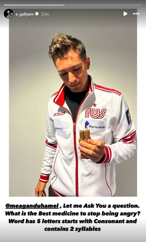 В The Skating Lesson заподозрили Александра Галлямова в сексистских нападках на бывшую канадскую фигуристку-парницу Меган Дюамель. Поводом послужил загадочный пост в соцсетях Галлямова, где он обратился к Дюамель и предложил решить ребус. Также он сопроводил вопрос фото, на котором держит раскрытый Twix. «Меган Дюамель, позволь задать тебе вопрос. Какое лекарство лучше, чтобы перестать злиться? Слово состоит из пяти букв, начинается с согласной и состоит из двух слогов», — написал Галлямов. Другие иностранные пользователи также не оценили головоломку, посчитав, что она носит оскорбительный характер, хотя и не объяснили суть своих претензий. Они поддержали Меган Дюамель, которая с грустью призналась в былой симпатии к Галлямову, и раскритиковали Александра за неподобающее поведение. Meagan Duhamel: «Это очень скверно, потому что он мне действительно нравился. Какое-то время они были моей любимой парой». Laura Wershler: «Можно было подумать, что они будут держать рты на замке, просто укр
