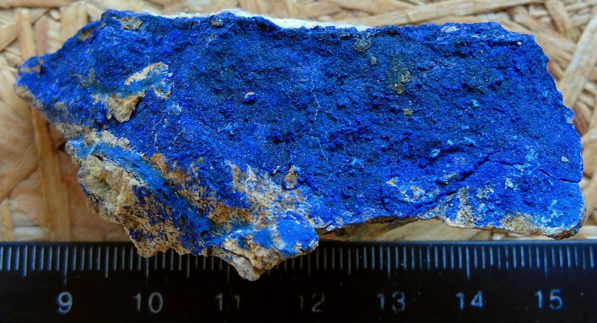 Одним из красивых минералов меди является азурит. Азурит всегда красивого синего, до тёмно-синего цветов. Встречается корочками, плёнками по камням с медной минерализацией, и реже сплошными массами в медных месторождениях и рудопроявлениях. Это минерал зоны выветривания (окисления). По опыту заметил, что азурит развивается по борниту, халькозину, блёклой руде. А малахит наоборот больше развивается по халькопириту и более редко по борниту и халькозину. По самородной меди больше развивается плёночный азурит и в меньшей степени малахит. Все образцы с азуритом очень красивые синих цветов, в отличие от малахита зелёных цветов. Как коллекционный минерал, азурит очень украшает любую коллекцию. Можно его найти в отвалах карьеров с рудой на медь. Есть месторождения медной руды, где азурит и малахит встречаются сплошными глыбовыми массами. Такие глыбовые массы поделочные и идут для изготовления ваз, чаш, шкатулок, украшений и других предметов. Более известные уральские малахит и азурит как п