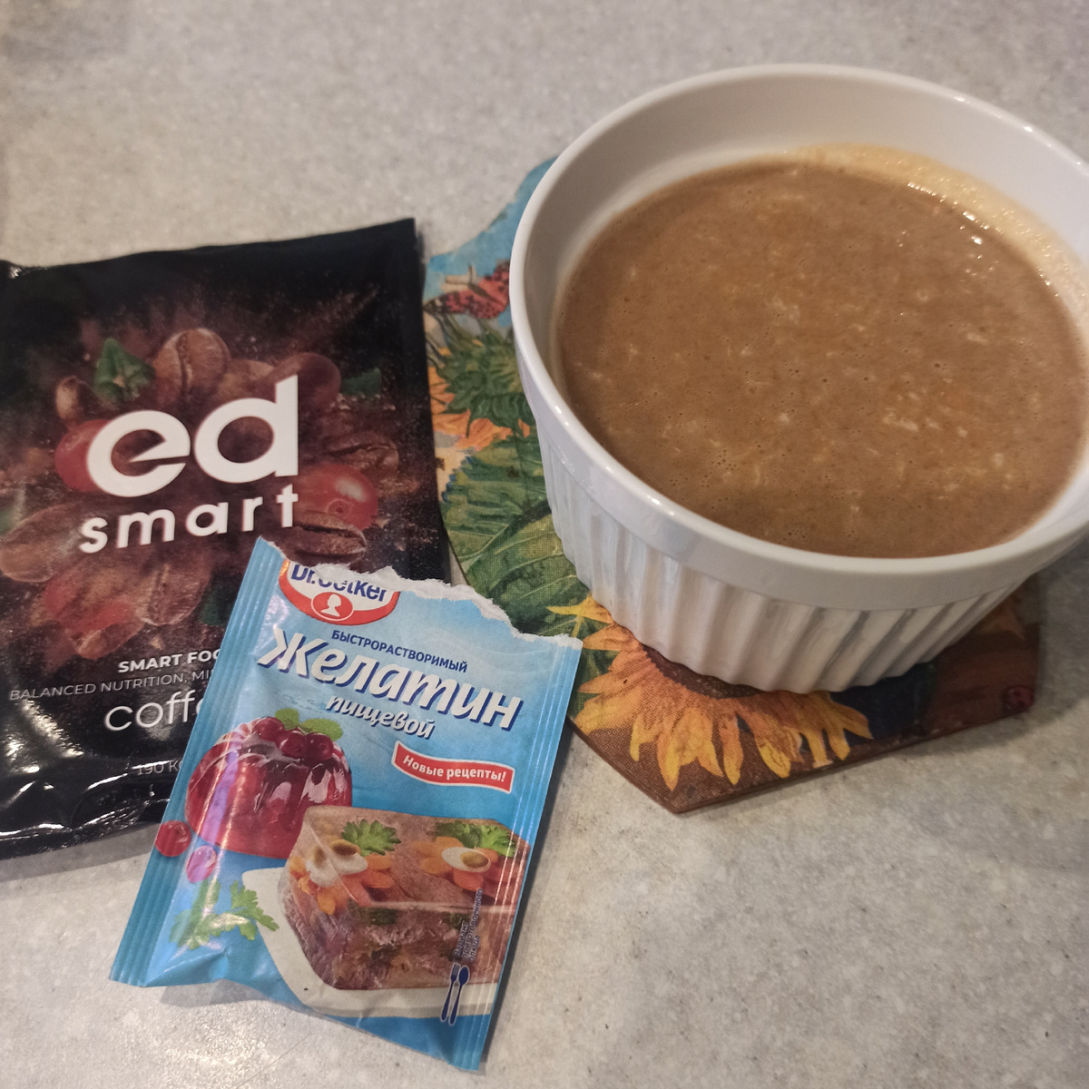 🔸1 пакетик ED smart 🔸10 гр желатина 🔸200 мл молоко *на мой вкус можно или 5 гр желатина пробовать, или на 10 гр молока 300 мл Еще я добавляю кокосовую стружку Я обычно делаю вечером и утром завтракаю паннакотой, так как один пакетик коктейля заменяет один полноценный прием пищи 👌