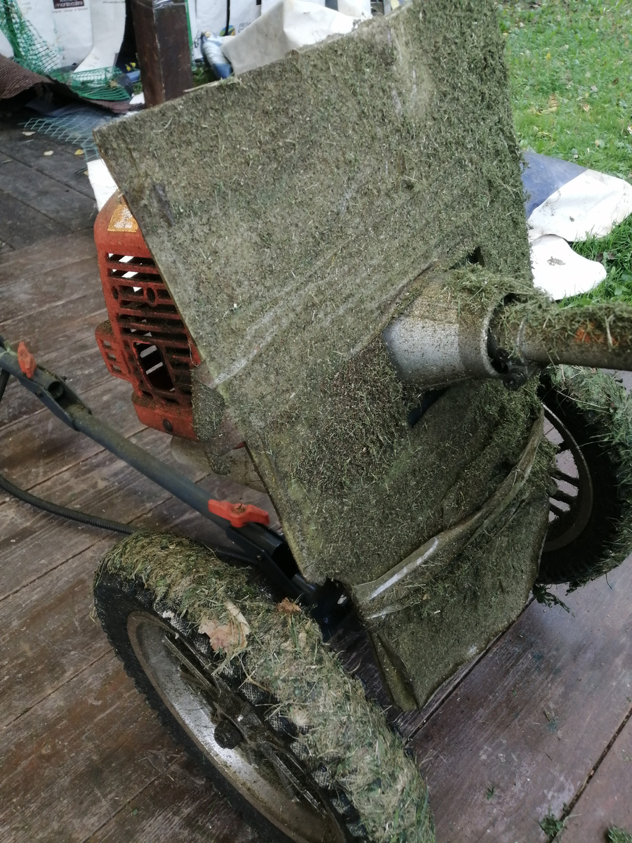 Так как леска находится далеко впереди, вопрос защиты от частичек травы из под лески особо не стоит, достаточно брюк и обуви, закрывающей полностью ноги. А вот двигатель от грязи надо защищать.