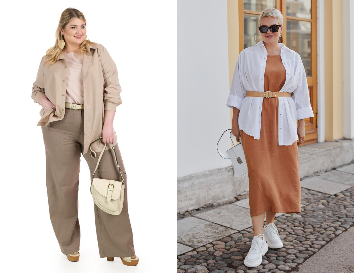 Обладательницам пышных форм стоит надевать рубашку в качестве второго слоя и носить нараспашку, а не застегивая на пуговицы и заправляя. Тогда полы рубашки будут образовывать вертикали, разбивающие силуэт по ширине на части. При наличии контрастных цветов можно добиться визуального постройнения.