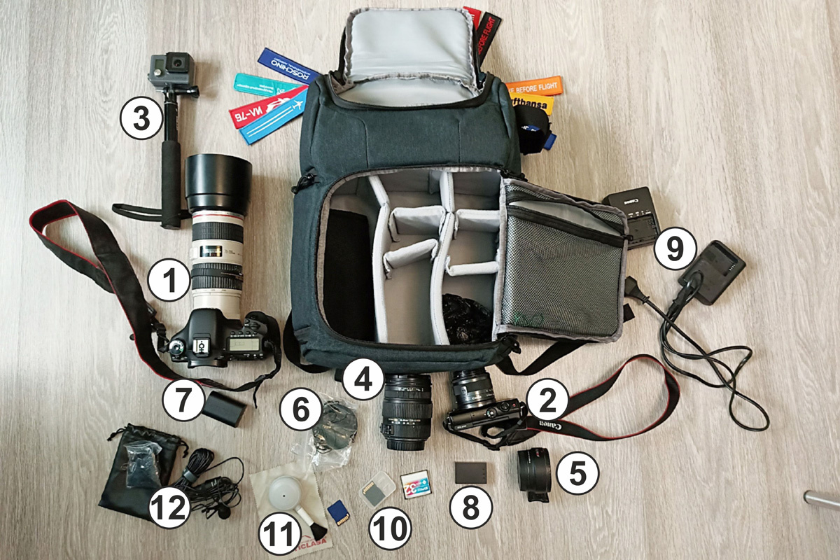 Название моего блога подразумевает что в каждое путешествие я отправляюсь с фотокамерой. Если точнее, со мной в поездках всегда мой фоторюкзак. Покажу вам его содержимое на примере недавнего путешествия на Северный Кавказ. Это оптимальная комплектация. И так, в фоторюкзаке: 1 - зеркальная камера Canon EOS 7D с объективом EF 70-200mm f/4L IS USM. 2 - беззеркальная камера Canon EOS M100 Kit 15-45mm STM. Камеры наготове именно с такими объективами, что обеспечивает быструю готовность к съемке практически на всех необходимых мне фокусных расстояниях. 3 - экшн-камера GoPro. Она мне необходима для съемки видео. Снимает под водой. Можно сделать селфи с большим захватом за счет широкого угла. 4 - объектив Sigma DC 18-50mm 1:2.8-4.5 HSM. Подходит на обе камеры (к беззеркалке через переходник). Давно со мной ездит. Не имеет выдвижных частей, а потому не засоряется. 5 - переходник для беззеркалки Canon EOS M100 для использования объективов от зеркалки. 6 - поляризационный фильтр. Част