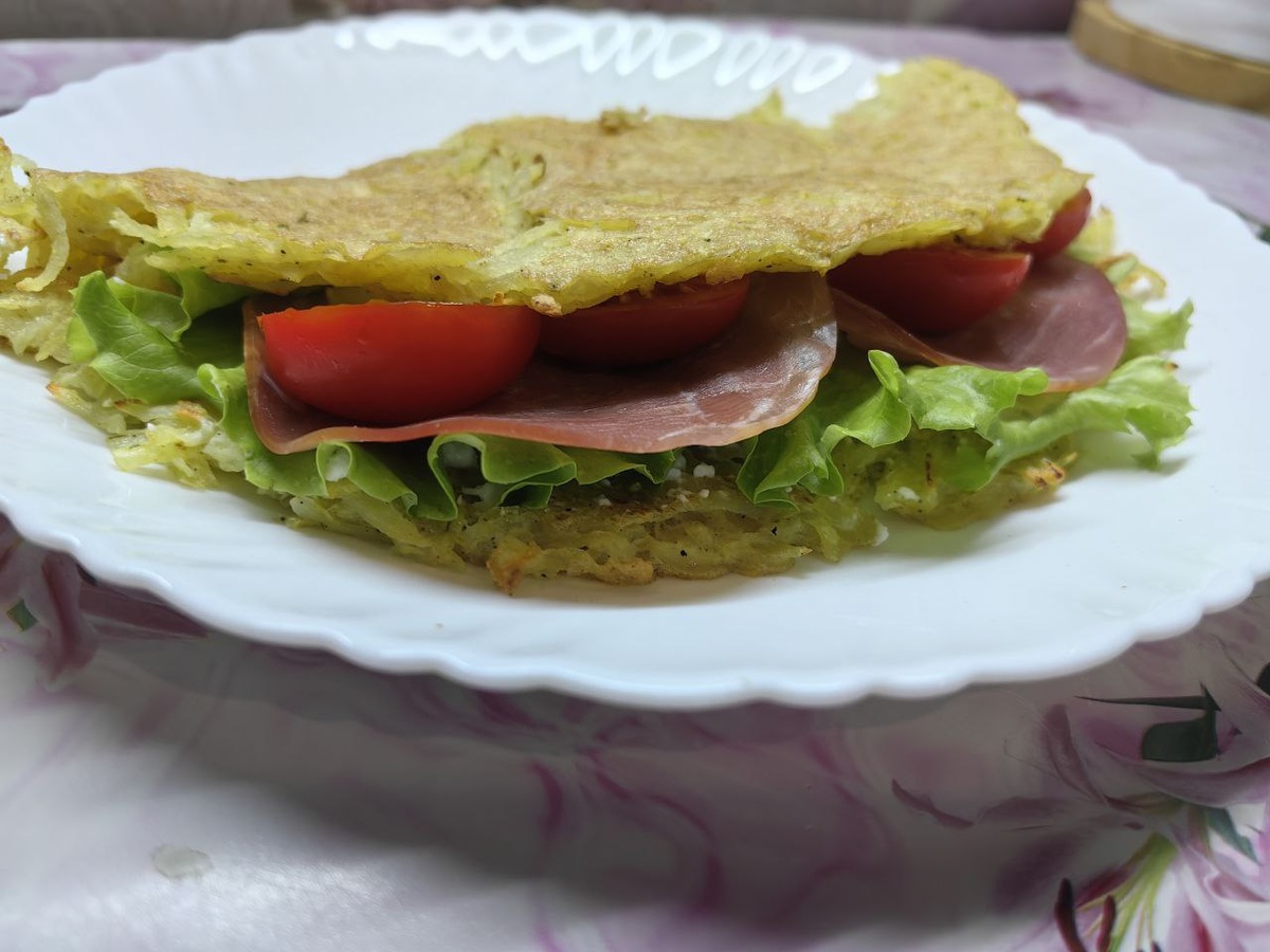 Картофель 170-180 гр. 1 яйцо Соль, перец, сухой чеснок, приправа для картофеля. Капелька оливкого масла. Дольки ветчины- 2 шт. Творожный сыр 40 гр. Помидоры черри 2-3 шт. На 100 гр продукта 2 средних картофелины примерно 160-180 гр,очистить, натереть на крупной тёрке, отдать лишнюю влагу добавит одно яйцо, соль перец , по вкусу можно добавить любимые специи, перемешать. Сковороду, у меня блинная, сбрызнуть и смазать каплей оливкового масла. Выложить получившуюся картофельную массу и сформировать драник " блин". Жарим под крышкой на среднем огне. Когда появился аппетитная корочка перевернуть и жарить с другой стороны. Начинка может быть любая , на ваш вкус. У меня это творожный сыр, лист салата, корейка, и помидоры Приятного аппетита:) Это Борис когда поел драник на завтрак.