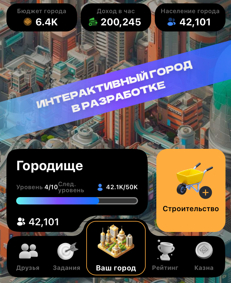 Игра в Telegram City Holder работает по тому же принципу, что и многие другие подобные проекты. Переходя по ссылке, вы должны придумать название для своего города, после чего становится доступно основное меню с городом и пятью пунктами внизу. Рассмотрим все пункты этого меню: — Друзья — туда заносятся все игроки, которых вы пригласили с помощью своей реферальной ссылки. Ежедневно они приносят вам доход, который нужно собирать вручную. ВАЖНО: друг не будет приносить НИКАКУЮ прибыль, пока не создаст собственный город и не даст ему название. Это сделано для того, чтобы бороться с генераторами ботов, — нужно проявить хоть какую-то активность. — Задания — небольшой источник внутриигровых денег на первых этапах. Нужно подписаться на социальные сети и пригласить несколько друзей. Возможно, в будущем раздел будет расширяться. Там же ежедневно нужно забирать награды за вход — тоже небольшая денежка. — Ваш город — главный пункт меню, именно через него вы будете строить город и увеличивать приб