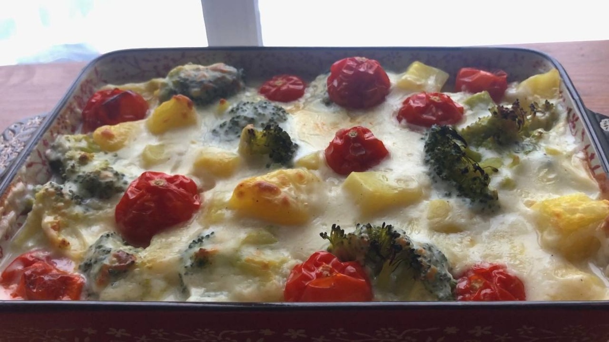 В кастрюлю налей воду, положи нарезанный кубиком 2х2 см картофель. Вари 5 минут после закипания. Разбери брокколи на соцветия, добавь к картофелю и вари еще 5 мин. Слей воду. Форму для запекания смажь растительным маслом. Выложи куриную грудку нарезанную кубиком 2х2 см. Посыпь курочку мелко рубленным чесноком и петрушкой. Выложи картофель с брокколи. В сотейник положи сливочное масло, растопи. Добавь муку, размешай венчиком. Добавь немного молока, продолжай мешать, смесь стала густой и без комочков, добавь 1/2 оставшегося молока. хорошо перемешай венчиком до однородности. Добавь оставшееся молоко. Мускатный орех и соль. Мешай до загустения. Часть молока выпарится. Соус готов. Залей соусом подготовленные овощи. Постучи формой о стол, чтобы соус хорошо распределился внутри. Добавь помидорки черри. Отправь в предварительно разогретую до 180 градусов духовку, готовь 25-30 минут. Приятного аппетита!