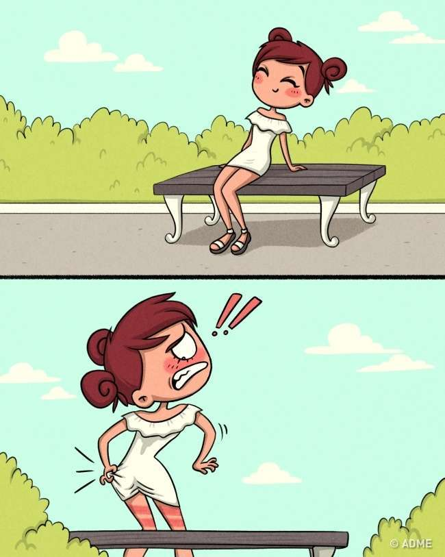 Астхик Ракимова, рисуя комиксы для АДМЕ, предложила нам два варианта выбора летних шорт для жары. Первый вариант предназначен для тех, кто не может избавиться от натираний и неудобства. Выбирая эти шорты, вы рискуете испытать настоящие муки, поскольку они, к сожалению, часто натирают и вызывают дискомфорт.