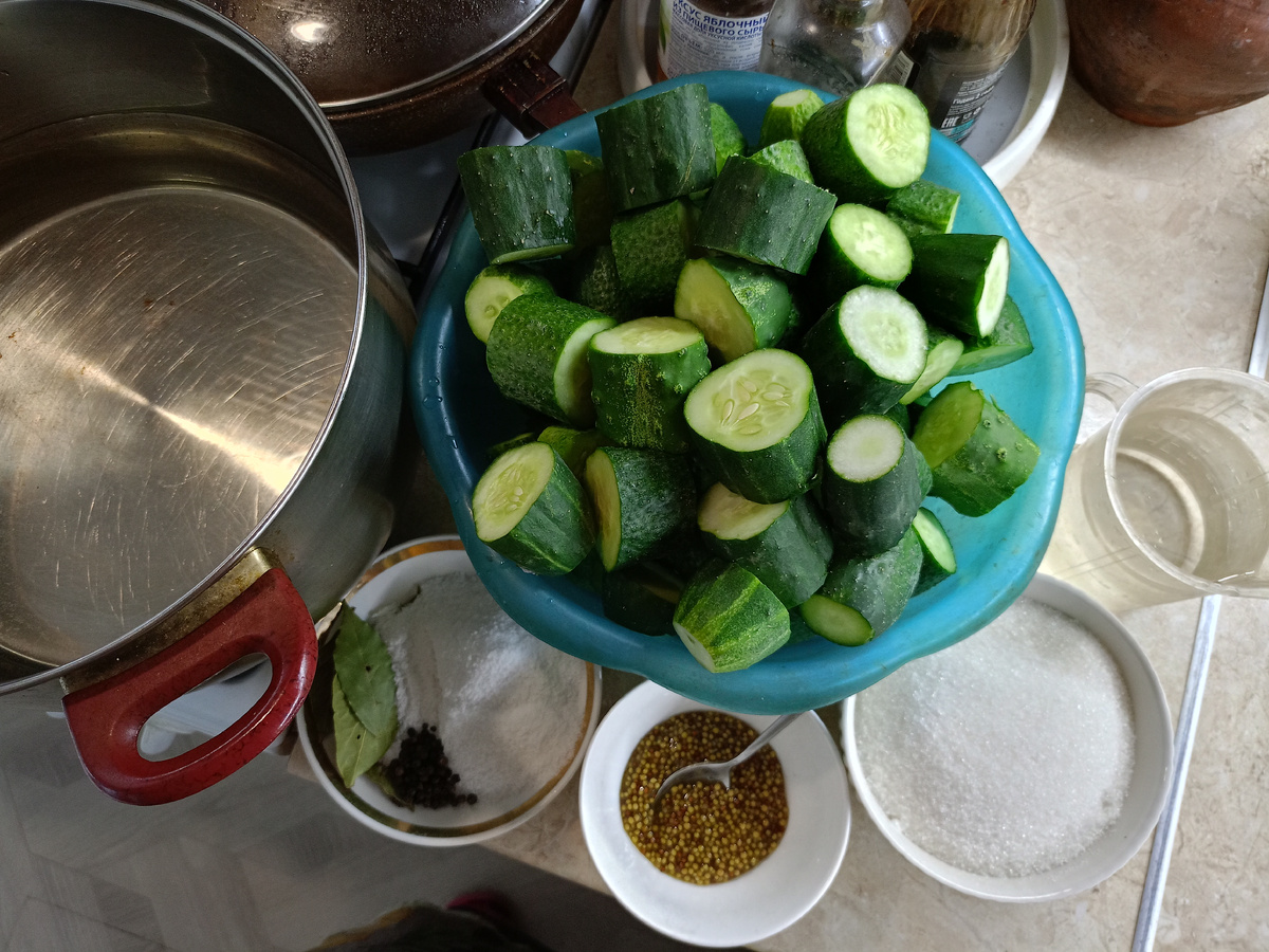 И снова здравствуйте! Держите меня семеро: заготовки продолжаются. Готовлю, когда муж на работе. Иначе не обойдется без ворчания:"Куда столько делаешь? Кто это все есть будет? Опять потом выбрасывать?" и т.д., и т.п. А мне хочется попробовать и новые рецепты. Это уже третий в этом году. были "Кабачки как ананасы" (очень понравились), "Огурцы для гамбургеров" и теперь "Огурцы по-фински". Рецептов много, сиди и выбирай на свой вкус. Количества продуктов в этом рецепте кардинально не меняются: кто-то больше положит лаврушки, кто-то совсем не кладет перец горошком, кто-то вливает яблочный уксус, а кто-то простой столовый 9%, есть незначительные расхождения в граммах соли и сахара. Все пробуем на вкус! Семян горчицы у меня не оказалось, поэтому я положила дижонскую (французскую) горчицу. Я готовила на 3 кг огурцов, а раскладку дам на 1 кг. Мне понадобилось: огурцы - 1 кг; вода - 1 л; соль - 2 ст/л с небольшой горкой (60 г); сахар - 130 г; уксус яблочный или 9% - 120 мл; семена горчицы - 1