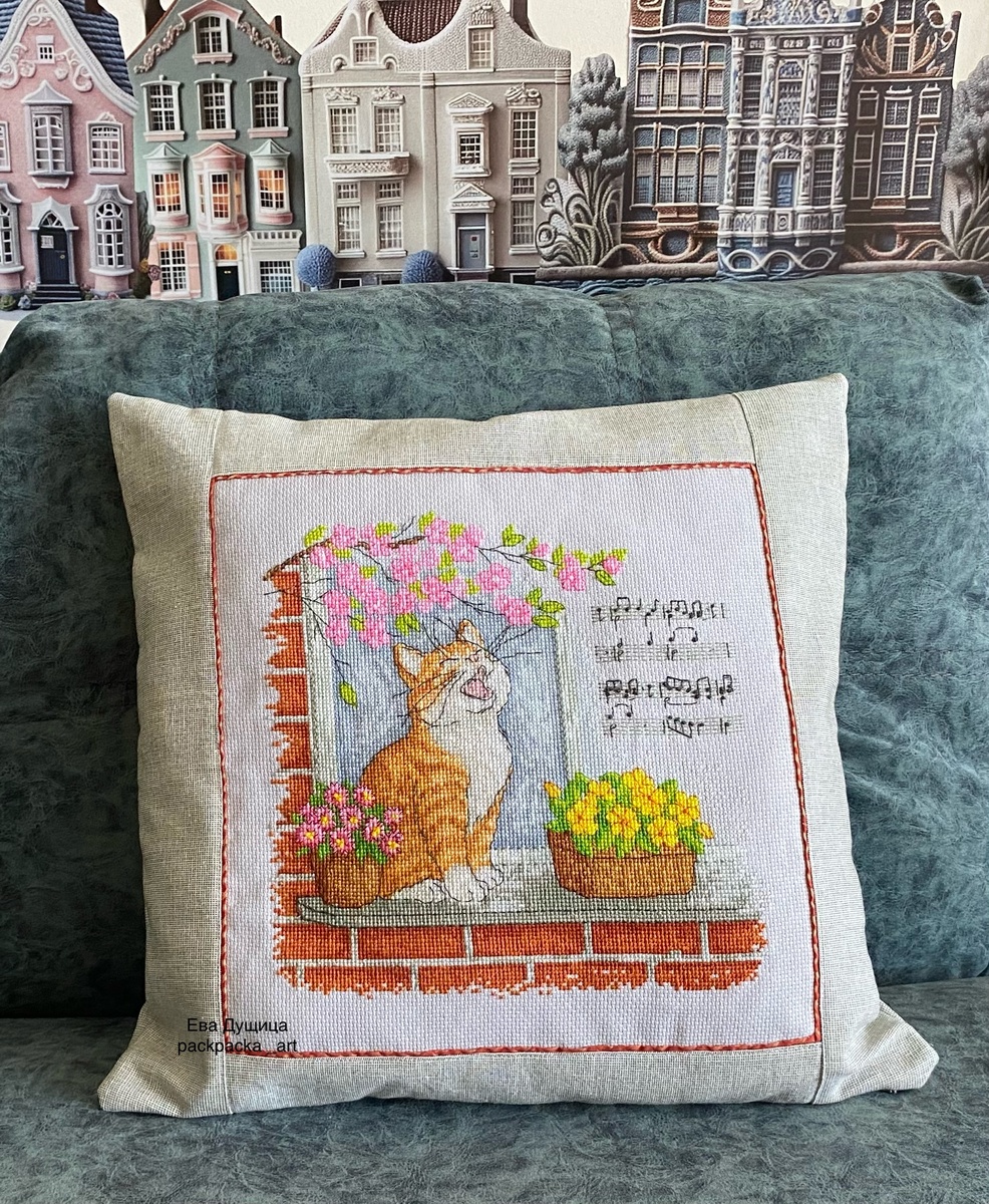 Получилась мягкая подушка, почти такая же уютная, как и вышитый на ней котейка.