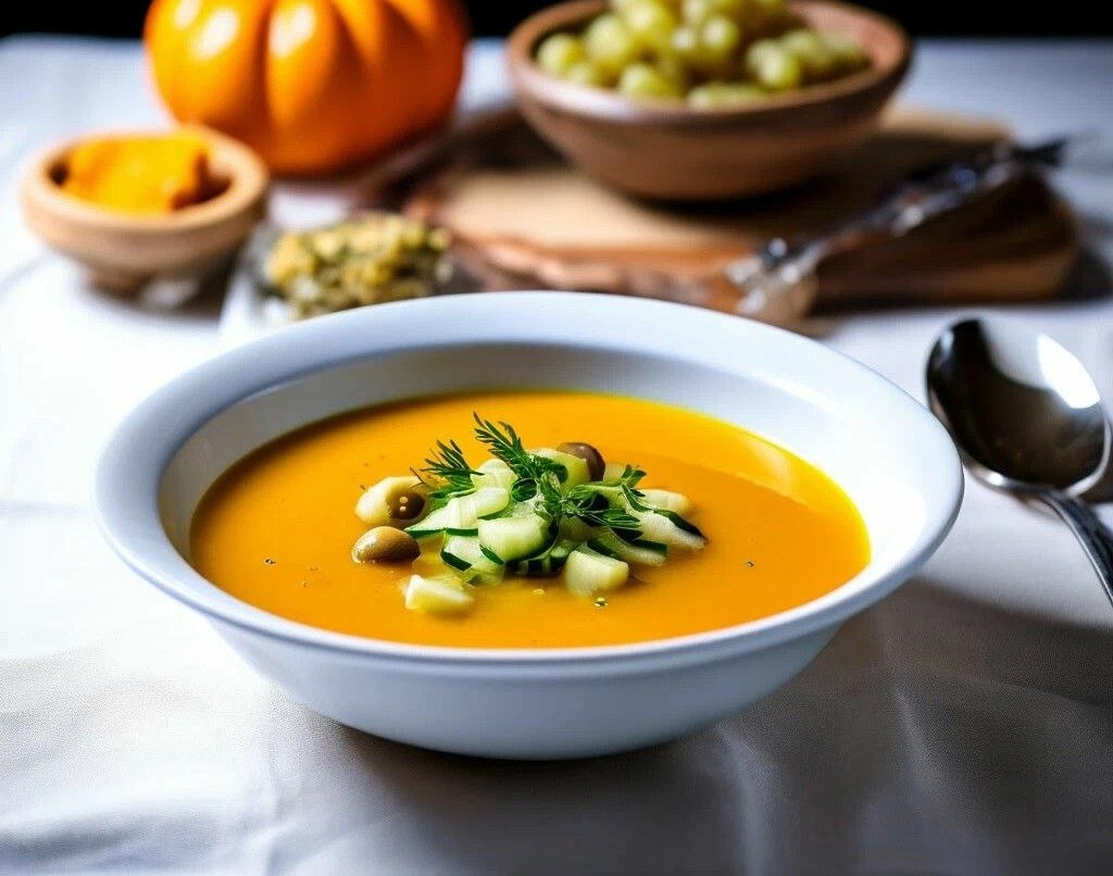 Холодный суп из кабачковой икры — это легкое и освежающее блюдо, идеально подходящее для жарких летних дней. Суп сочетает в себе нежность кабачков и пикантность маслин, создавая неповторимый вкус. Такой суп не только вкусен, но и полезен, благодаря низкой калорийности и богатому составу витаминов и минералов. Ингредиенты: Кабачковая икра — 400 г Оливки или маслины без косточек — 1 банка Огурцы — 2 штуки (среднего размера) Лимонный сок — 2 столовые ложки Оливковое масло — 2 столовые ложки Чеснок — 2 зубчика Вода (охлажденная) — 300 мл Соль, перец — по вкусу Свежая зелень (укроп, петрушка) — для украшения Время приготовления: Общее время приготовления: около 20 минут Калорийность на 100 грамм: Холодный суп из кабачковой икры готов. Приятного аппетита! Подписывайтесь на канал "Вкусно Очень"