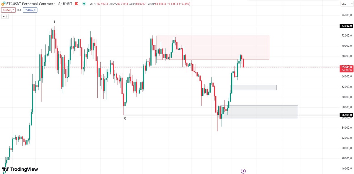 На сейчас торгуемся в основной зоне сопротивления, откуда до сих пор очень большая вероятность уйти на коррекцию, чего и ожидаю. Зоны интереса для покупки на дневке, остаются те же - серая зона. Покупок пока не совершал, если уйдет без отката то я просто буду ожидать понятную для меня ситуацию. Если посмотреть график CME, то у нас оставили не перекрытый геп ~ 58800-60800, что так же стоит д