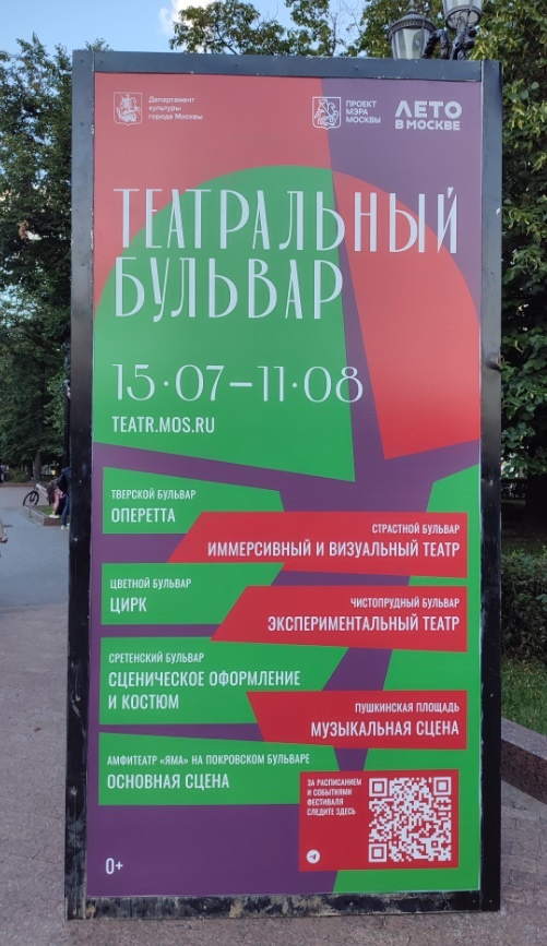 Сцена на Тверском бульваре предоставлена театру Оперетты. Знаменитые актёры театра выступают с отрывками из спектаклей. В уличном зрительном зале яблоку «негде упасть». Страстной бульвар. Иммерсивный и визуальный театр.