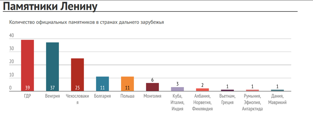 Недавно была проведена попытка посчитать - кому из людей поставлено больше всего памятников в мире? Посчитать точное количество оказалось тяжело, но появился ряд финалистов: Будда, В.И. Ленин и Мао Цзедун. И если с памятниками Будды понятно, его фигурки можно встретить в любом городе и многие из них продаются в магазинах, то с конкретными памятниками посчитать оказалось сложнее. Но даже посчитать памятники В.И. Ленину оказалось сложнее всего. Оказывается, что даже на территории Российской Федерации нет реестра всех памятников. В 2003 году "Московский комсомолец" выдвинул теорию, что на территории РФ их 1800, а бюстов - более 20 тысяч. Но пользователи интернета провели свои расчеты. Был создан сайт "lenin.tilda", на котором создали базу всех памятников Ленину, которые пользователям удалось найти. Их количество на сайте в данный момент 10 612. При этом, не менее 7 тысяч из них находятся на территории Российской Федерации, а не около 5500 памятников было найдено на территории Украины.