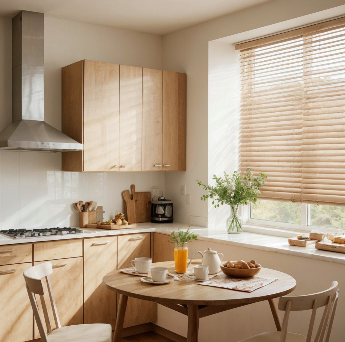 Практичность штор плиссе очевидна. Они эффективно защищают от избыточного солнечного света и посторонних взглядов, создавая комфортную обстановку на кухне. В летнее время они помогают поддерживать прохладу в помещении, отражая солнечные лучи, а в зимний период — сохранять тепло. Это особенно важно для кухни, где температура может значительно меняться в зависимости от готовки. К тому же, шторы плиссе не требуют сложного ухода — их легко чистить и мыть, что важно для поддержания чистоты в зоне приготовления пищи.