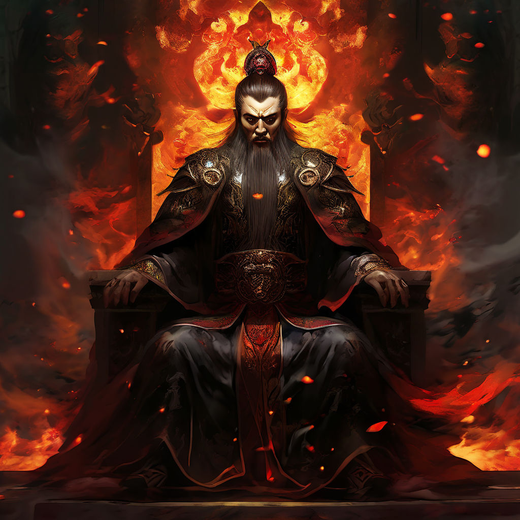 Цинь Гуан Ван изображается как властный правитель с жестким выражением лица, сидящий на троне в окружении свиток и весов.