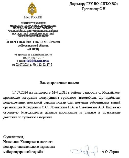 «Выражаю огромную благодарность работникам за смелые и правильные действия по тушению загорания», – пишет начальник Каширского местного пожарно-спасательного гарнизона.