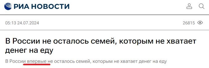 Всеми горячо любимое федеральное СМИ "РИА Новости" на основе данных не менее горячо любимого всеми Росстата опубликовало материал под заголовком "В России не осталось семей, которым не хватает денег на еду". Причем, подчеркивается, что такая ситуация сложилась впервые за всю историю, во как!