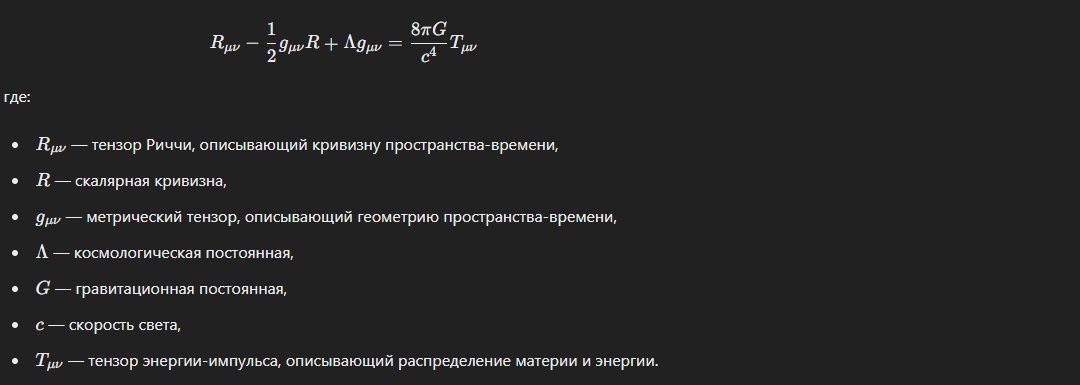 В рамках Общей теории относительности, предложенной Альбертом Эйнштейном, гравитация понимается не как сила в привычном смысле, а как результат искривления пространства-времени, вызванного присутствием массы и энергии. Эта концепция глубоко изменила наше восприятие физической реальности. Масса и Энергия Прогибают Пространство-Время: Согласно общей теории относительности, материя и энергия искривляют пространство-время вокруг себя. Это искривление влияет на движение объектов, заставляя их следовать изгибам пространства-времени. Уравнения поля Эйнштейна: В искривлённом пространстве-времени объекты движутся по геодезическим линиям, которые являются кратчайшими путями в этой искривлённой геометрии. Это аналог прямых линий в плоском пространстве, но в кривом пространстве-времени они могут быть изгибами. Геодезические уравнения: Представьте себе резиновый лист, на который помещен тяжелый мяч. Лист прогибается под весом мяча, создавая вмятину. Если вы поместите два меньших объекта (например,