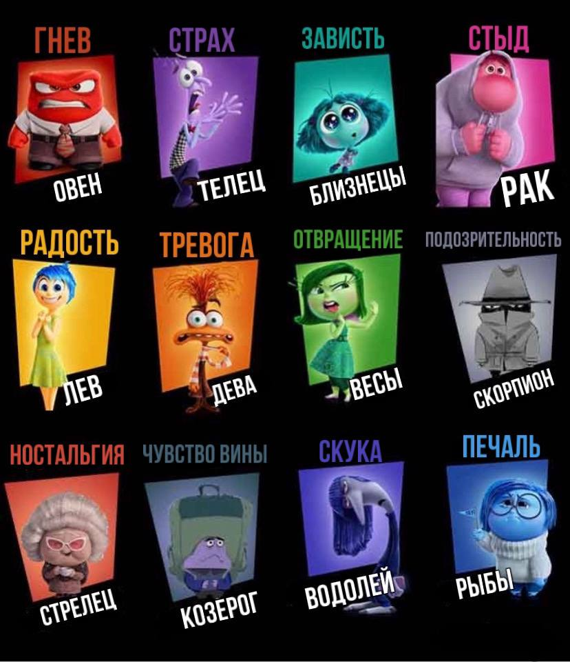 В мультфильме представлены нетипичные эмоции, далеко не все из которых позитивные, и в этой статье я тоже обращаюсь к ним. Также важно помнить, что представители одного знака зодиака могут быть совершенно разными по характеру. Я опиралась на общепринятые характеристики знаков, но не стоит воспринимать все сказанное слишком серьезно.