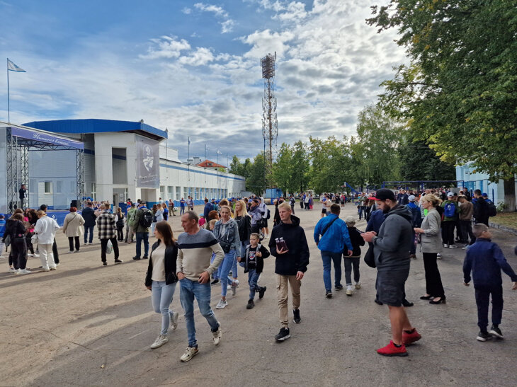 Первое, что увидел, подъехав к стадиону, — закрытую кассу с написанным от руки объявлением «Билетов нет». На площади перед трибуной многолюдно, празднично. Продаётся еда и атрибутика (купил красивый динамовско-вологодский шарф). Диктор что-то громко говорит, объявляет. В общем, имеет место атмосфера дерби, пусть и скромного.