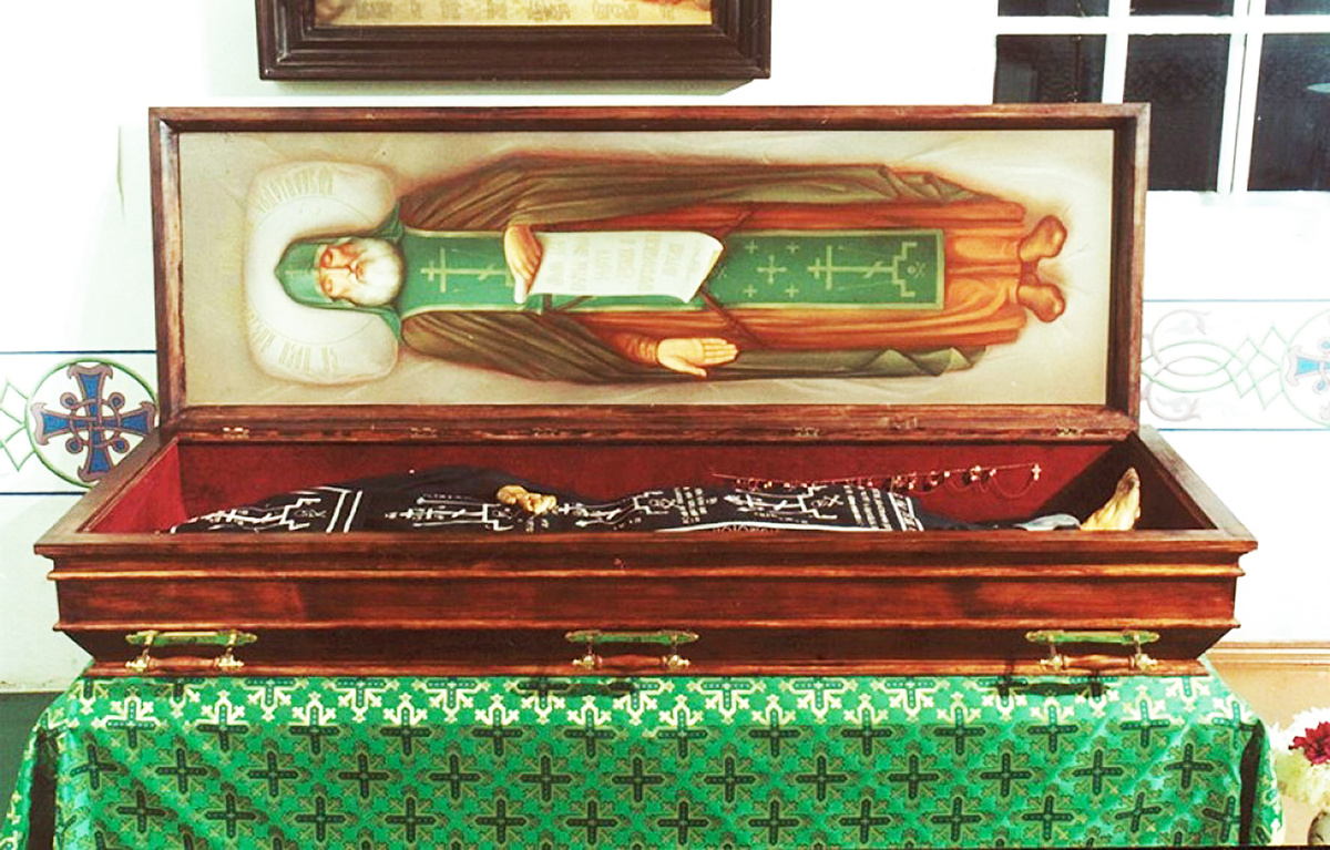 Я надел епитрахиль - священную одежду, и спустился в склеп. Легко поддев гвозди и приподняв крышку гроба, я с замиранием сердца опустил свою руку внутрь. И тотчас мои пальцы ощутили сначала ткань, покрывающую тело усопшего св. Тихона, а потом плечо…