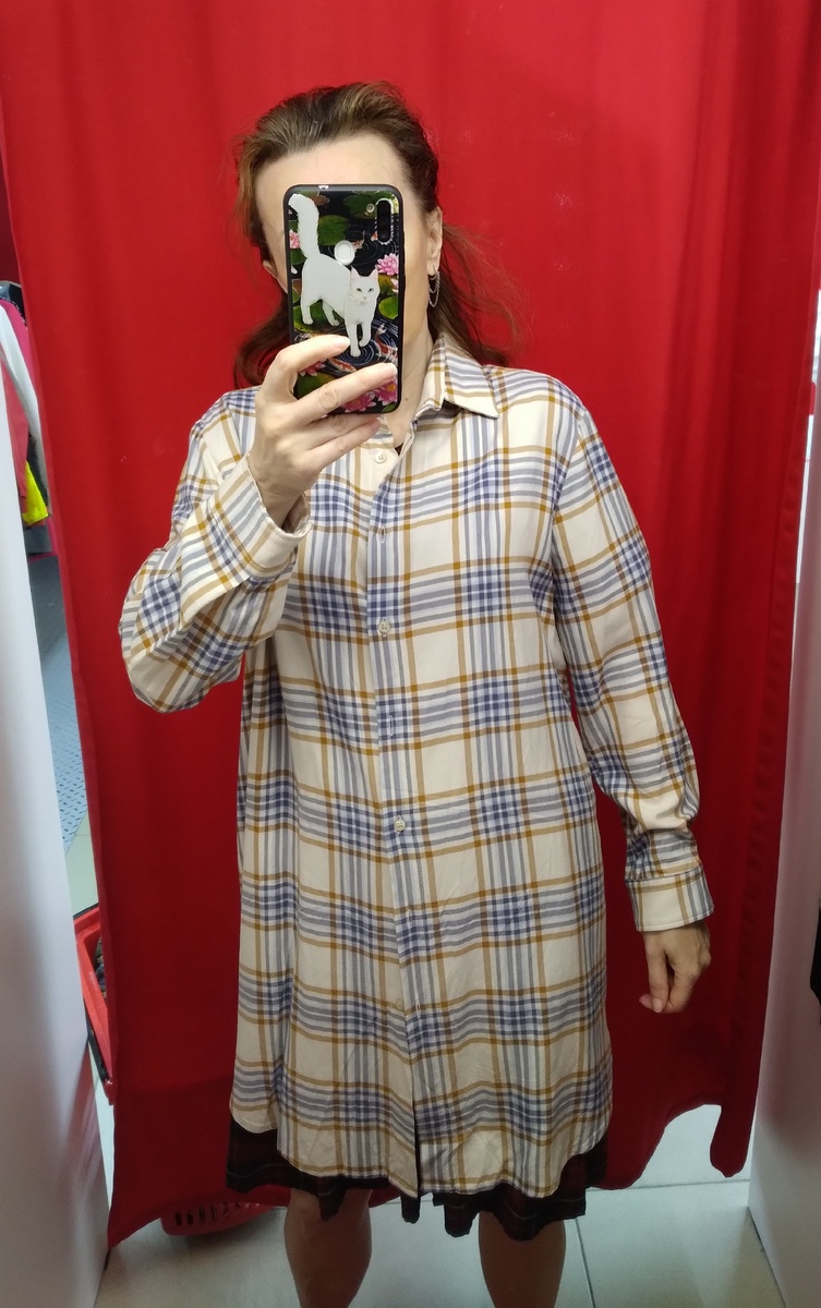Здравствуйте, вчера зашла я в секонд на скидку 490 рублей за кг. Этот секонд можно сравнить с экстремальным видом спорта, выживает сильнейший и побеждает самый выносливый. Помещение подвальное, окон нет, есть духота страшнейшая, кислорода по минимуму, если выжил тут, то можно лезть на любые горные вершины, к кислородному голоданию уже не привыкать, так сказать тренировки каждую среду. Вчера пришла в магазин и думаю, что мне так хорошо и голова ещё не болит, а оказывается кондиционер поставили, огромная бандура висит на потолке и дует как ураган)). Праздник какой-то и на этой радости я даже пальто себе купила за 300 рублей)). Как соберусь с силами так покажу. А пока обзор) То ли платье, то ли рубашка, для меня точно платье, хотя висела в блузках. Без состава, но похоже на хлопок. По спинке вшита металлическая молния. Немного расклешенное платье со спущенными рукавами. Красивый узор, конечно платье нравится, но абсолютная синтетика, ткань плотная и немного шершавая. Бежевый свитер, по