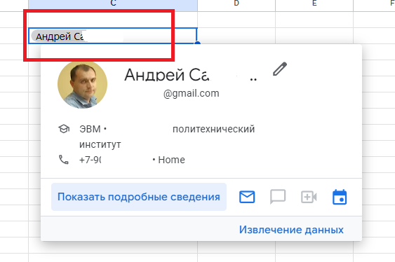 Впервые умные чипы появились в Google Таблицах в 2021 году. Это было более трех лет назад! С тех пор Google добавила больше типов и функций смарт-чипов. Smart Chips являются частью концепции Smart Canvas от Google — функции совместной работы, призванной сократить количество переключений контекста и сделать работу между файлами более плавной. В частности, смарт-чипы дополняют наши таблицы внешней информацией, выходящей за рамки стандартных данных, содержащихся в ячейках. Умные чипы существуют в вашей таблице в виде серых «таблеток» внутри ячейки, которые показывают всплывающее окно при наведении на них курсора. Существует шесть основных смарт-чипов: Пример: чипы людей показывают вам фотографию профиля человека, адрес электронной почты и местоположение, а также содержат кнопки действий, которые позволяют нам отправлять ему сообщения или начинать вызов Meet: Вы также можете извлекать данные из смарт-чипов , используя синтаксис извлечения данных. Например, вот как извлечь адрес электронной