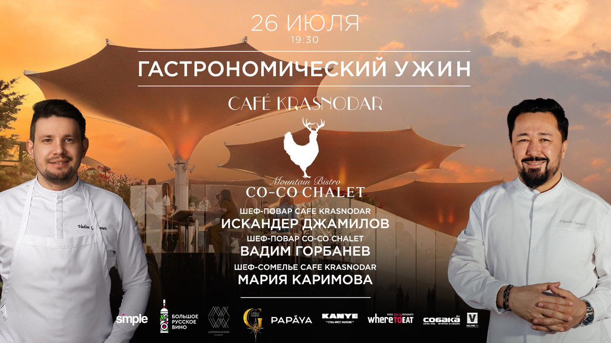 Краснодар 26 июля (пятница) в Café Krasnodar пройдет гостевой ужин в четыре руки «Еще южнее». В гости к Искандеру Джамилову приезжает шеф-повар краснополянского ресторана Co-Co Chalet Вадим Горбанев. В меню: сахалинский гребешок с сезонными томатами; пате из утиной печени с желе из хереса, жемчугом из инжира и луком конфи; дальневосточный кальмар и креветки с цукини и соусом из печени трески; запеченный баклажан с ореховым соусом, пармезаном и краснополянским фундуком; угольная треска с лисичками, спаржей и соусом бермонте из мидий; питивье из подкопченного ягненка с лесными ягодами; десерт с сорбетом из дыни и крыжовника, печенья спекулоз и сливочного мусса. Цена - 7 тыс руб. Начало в 20:00 Разведчика Леонова 4. (парк «Краснодар») Казань 30 и 31 июля в спикизи-баре Mr.Willard пройдет вечер от ресторана «Дворцовая» и бара «Д.Иванович» из Тобольска. Ужин начнется с печеной свеклы с омулем и домашним сыром, компанию которой составит коктейль «Боблово» на основе кампари, рома на черной см