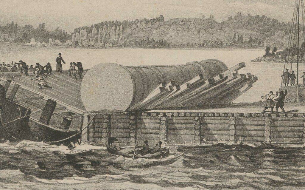 Мой любимый момент в истории об Александровской колонне, это её падение. При погрузке колонны 28 брусьев настила проломились и колонна упала на край судна, но 600 солдат подхватили колонну и бодро держали двое суток, пока не изготовили новый настил для погрузки. А теперь медленно и с цифрами: 600 солдат бежали 36 верст (это 40км за 4 часа. Опустим, что это марафонская пробежка - колонну надо спасать!), а потом держали колонну в 700 тонн. Это больше тонны на человека (супермены, а не солдаты). Так еще эта 700-тонная колонна не утонула за 4 часа, пока ждала солдат, а только немного накренила судно. Для гуманитариев, далеких от судостроительства, рекомендуется почитать про "центр тяжести", "угол заливания и расчета остойчивости". Колонна уйдет в воду, перевернув судно, без вариантов. Подводя итоги: рисунок Монферрана - это чистая фантастика, а как грузили и доставляли колонну так и неизвестно.