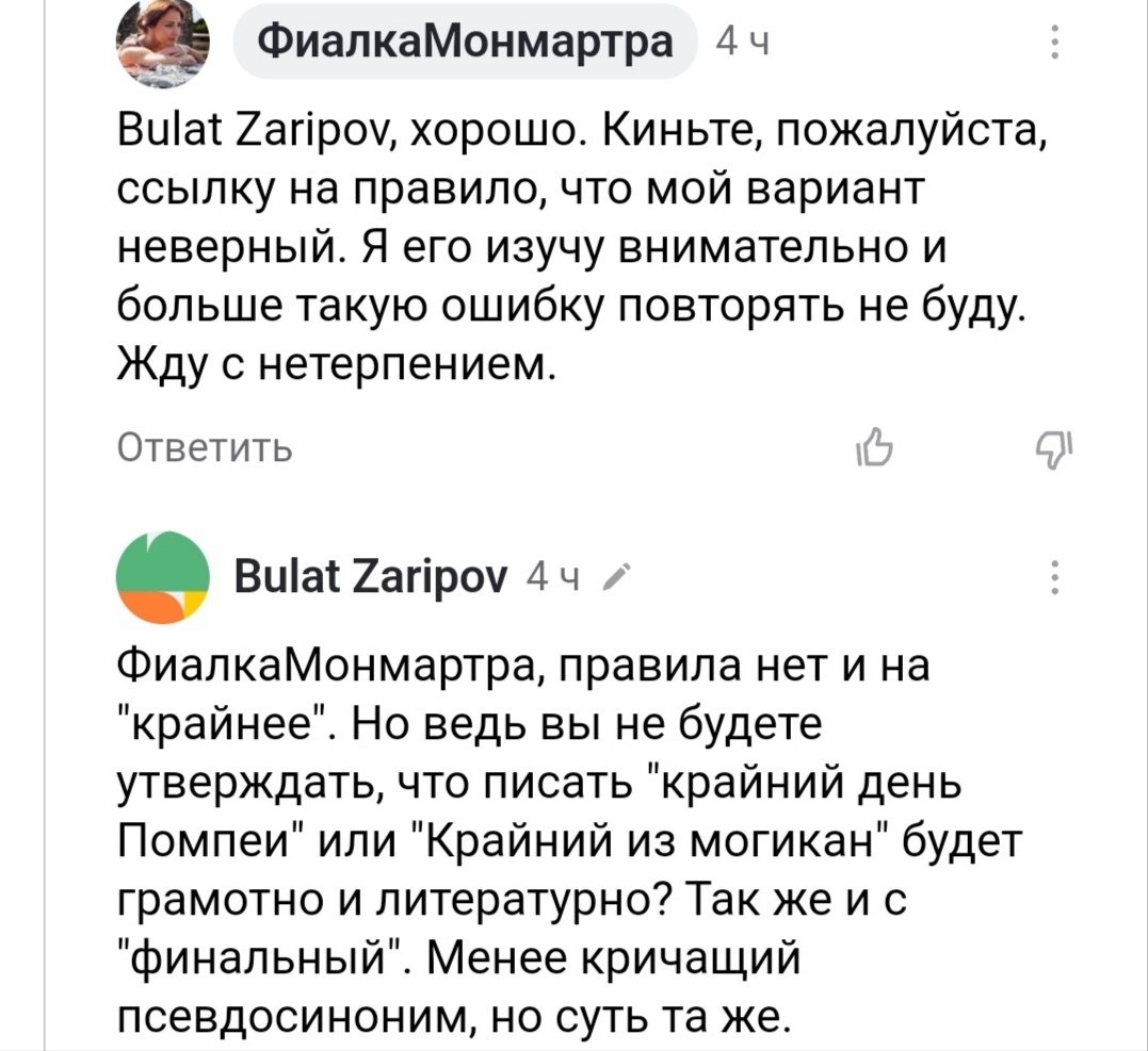 Скажите, мои дорогие читатели, когда в моду вошло употребление слова "крайний" вместо слова "последний"? Мне кажется, чуть больше десяти лет назад. Первый раз на "крайнего" я обратила внимание, когда увлеклась книгами писателя Тармашева. Вот там частенько это слово употреблялось. Я сначала не поняла, почему так, слишком уж непривычно, необычно и не сосем по правилам русского языка. Оказалось, так говорят люди опасных профессий - военные, летчики, саперы. Сленг плюс суеверие. Ну... почему бы и нет? Говорят же моряки "компАс", говорят полицейские "осУжденный", не выносят цирковые, когда их "циркачами" называют, а самая страшная примета для актера - уронить текст роли. У всех, как говорится, свои тараканы. Военные - тут без вопросов. А когда я на съемках какого-то сериала услышала от актера массовки "на крайней съёмке мне выдали костюм..." - тут мне уже стало не очень понятно. Ты-то, любезнейший, чем так сильно рискуешь, что боишься слова "последний"? Справедливости ради, могу сказать, ч