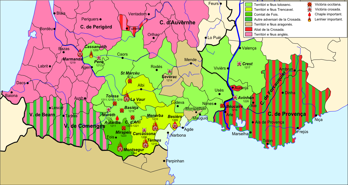 Ключ к пониманию успеха первоначального успеха катаров в Лангедоке – слабость правящей династии. Совсем рядом находились Прованс и королевство Арагон под властью Барселонского дома и что же мы видим? Катары там тоже есть, но какие же они там скромники, и ведь не сказать, что у каталонских графов с Римом пылкая любовь. Позже всё вообще взорвется отдельным Крестовым походом против Арагона, но это была уже чисто политическая авантюра, а не религиозная контратака Рима, в которую с горячей головы вляпался еще и король Франции Филипп III.