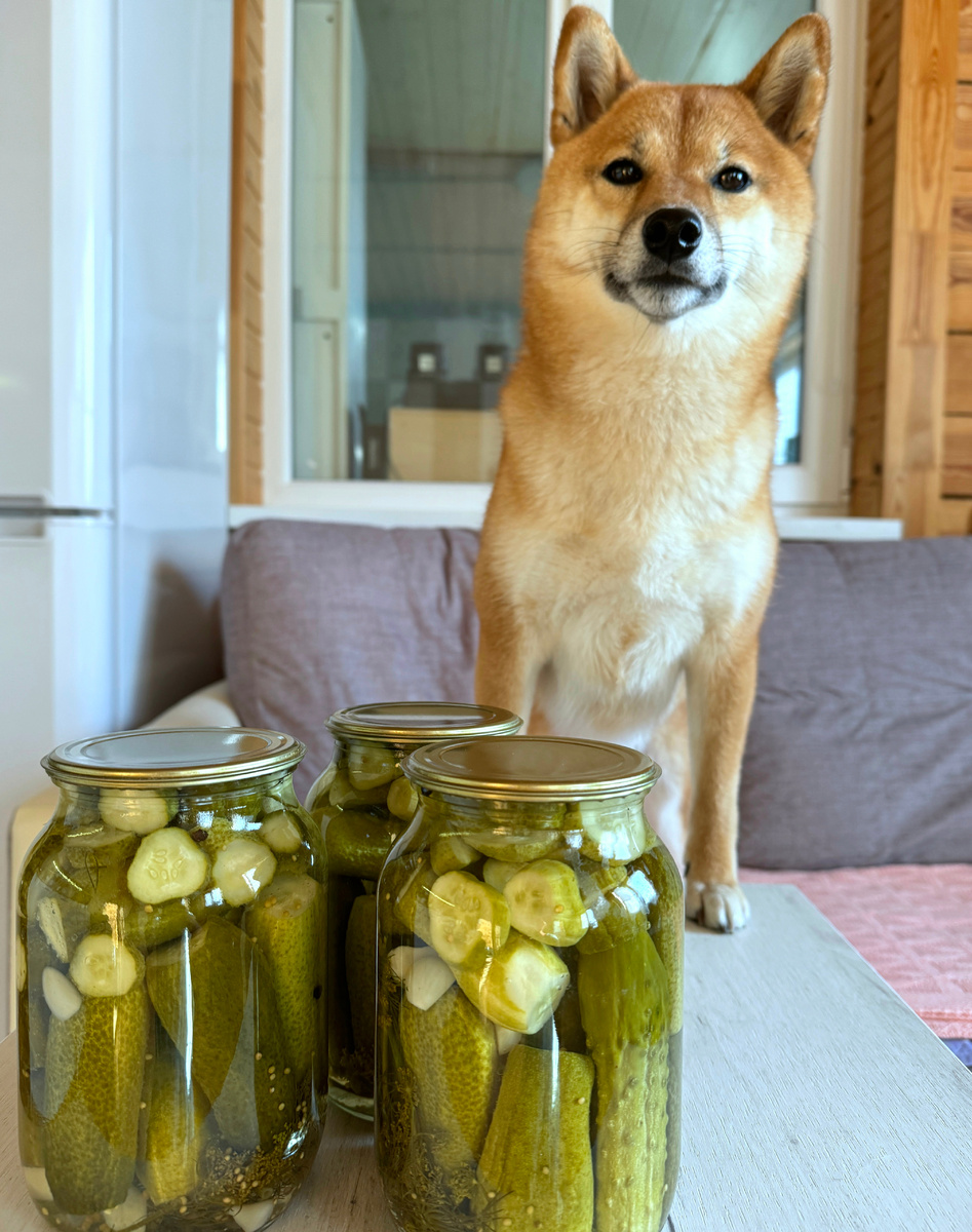 Ну а что мы всё о тренировках, да о тренировках. Давайте поговорим про что-нибудь вкусное. Клубника у нас уже была. На очереди огурцы! Сколько бы я их ни сажала, их всегда тьма. Начинала я с 15 кусов, на следующий год сократила количество до 13, потом до 9, до 7, и в этом году посадила всего 5 кустов. Но даже с 5 кустов я каждый день собираю по пакету. Дайкиря, конечно, помогает! Сначала я собираю огурцы в теплице, а потом собираю еще раз по участку всё, что успела утащить мелкая бестия. Наименее пострадавшие экземпляры отправляются в дело. Конечно, товарищей со следами укусов приходится отправлять в компост или сдавать на доедание прожорливой сибе. Приношу урожай домой, снимаю галоши в прихожей, замачиваю огурцы в тазике, бегаю за рыжей нахалкой по участку, которая успела унести мои галоши. В итоге вымениваю галоши на сыр. Ну а дальше начинается самое интересное - мы тщательно промываем свежайшие огурчики, а потом опять их замачиваем в ледяной воде часа на четыре, так они останутся кр