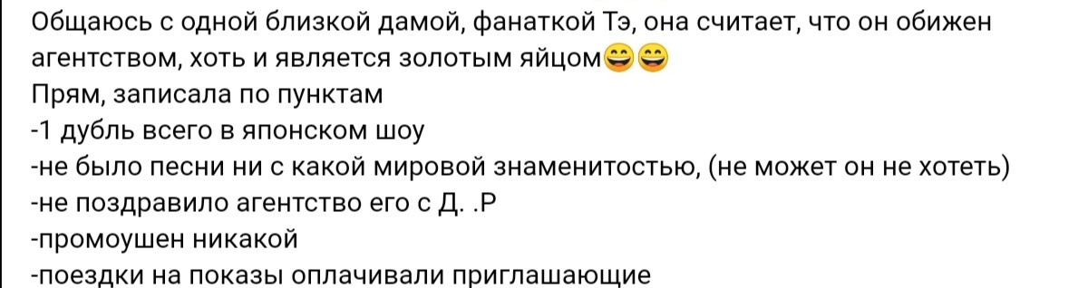 Вообщем, не знаю, что хочет Дзен, но я буду делать то, что хочу я😀 Поэтому раз есть вопрос , то я буду отвечать там, где и как мне удобно. Попросили высказать моё мнение по вопросу взаимоотношения Тэхён-Хайб. Высказываю)). Сразу добавлю к этому списку возмущения техеностэнов ещё) Обид накопилось много. L версия альбома Love Yourself Answer на Weibo. Где фотки Тэхена? Попробуйте найти.. Песня, которая длилась 4 минуты.. Сколько у Тэ?. 22 секунды. Love Moze... Соло? А зачем? Хваран. Продюсер чётко хотел именно Ви. Кто пробовался? Все! Было ли промо от бигхита Ви после выхода Хваранов? Нет Так же как и не было промо Sweet Night. Контент с Ви на официальном сайте был по минимуму. Так же шла и загрузка его песен на на ютубе. Где коллабы с теми кого он любит и уважает(не Корея) ? Ждём-с)) «У меня есть около 13 мелодий, но агентство отвергнуло практически все". Не формат? Промо его альбома выстрелило фактически потому, что он сам им
