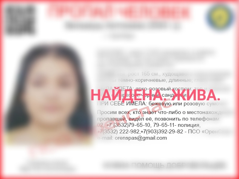 Сотрудники полиции и волонтёры ПСО «ОренСпас» устанавливают местонахождение Антонины Вильмуш. Жительница Оренбурга пропал 23 июля 2024 года. В последний раз её видели в районе ТК «Гулливер» около 12.45. Оттуда девушка уехала на неустановленном автомобиле в неизвестном направлении. До настоящего времени местонахождение пропавшей не установлено. Приметы: рост 165 см., худощавого телосложения, длинные тёмные волосы, карие глаза. Была одета: ярко-розовый костюм (топ и длинная юбка с вырезом), чёрные сандалии. При себе имела: бежевую или розовую сумочку. Всех, кто что-либо знает о местонахождении пропавшей или видел её, просят позвонить по телефонам: 02, +7 (3532)79-65-10, 79-65-11- полиция, +7(3532) 222-982,+7(903)392-29-82 — ПСО «ОренСпас». По данным на 26 июля, девушка найдена живой.