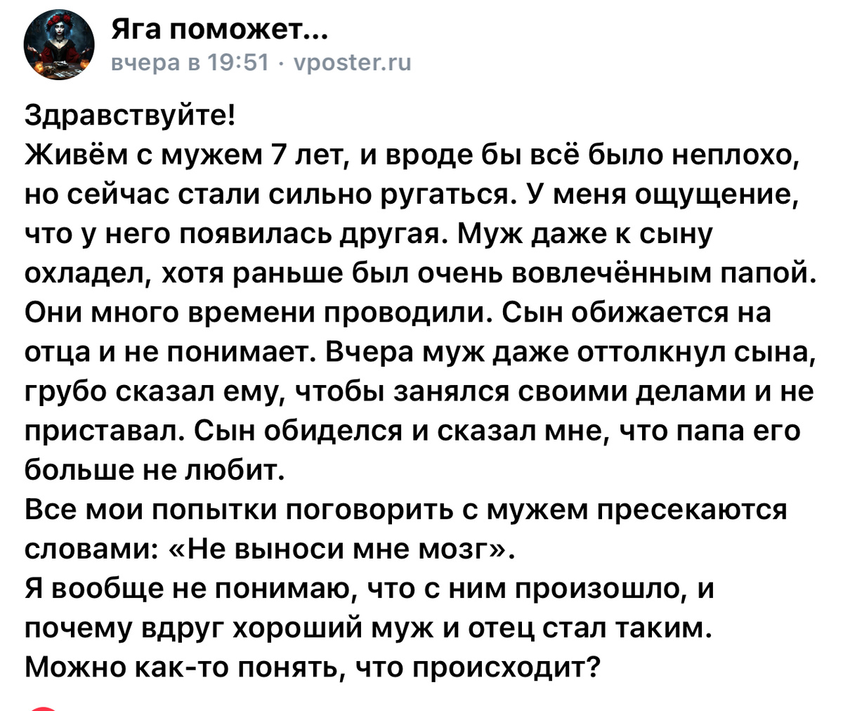 Есть у меня группа в ВК, она про психологию и таро. И есть там такая форма, для отправки анонимного вопроса. На пришедший запрос я сделала небольшой расклад на картах и ответила так, как карты выпали. Отвечаю на вопрос. Сделала небольшой расклад. Другую женщину карты не показали, а вот усталость и выгорание у Вашего мужа очень даже. Что-то у него случилось, возможно по работе. Ему сейчас реально сложно, возможно какая-то ситуация, которая ему кажется безвыходной. Любые Ваши претензии ему кажутся «выносом мозга», просто потому что его мозг уже не вмещает проблемы. Дома мужчине хочется покоя, чтобы его оставили с проблемами разбираться, а не вот это вот всё. Мужчины так устроены, что если на них наваливаются проблемы им надо их переварить, переспать с ними, возможно не одну ночь, чтобы в голове прояснилось, чтобы увидеть выход. Не все мужчины готовы рассказывать женщине о трудностях. Поддержку в данной ситуации Вы можете оказать только в одном, оставить мужа в покое, создать спокой