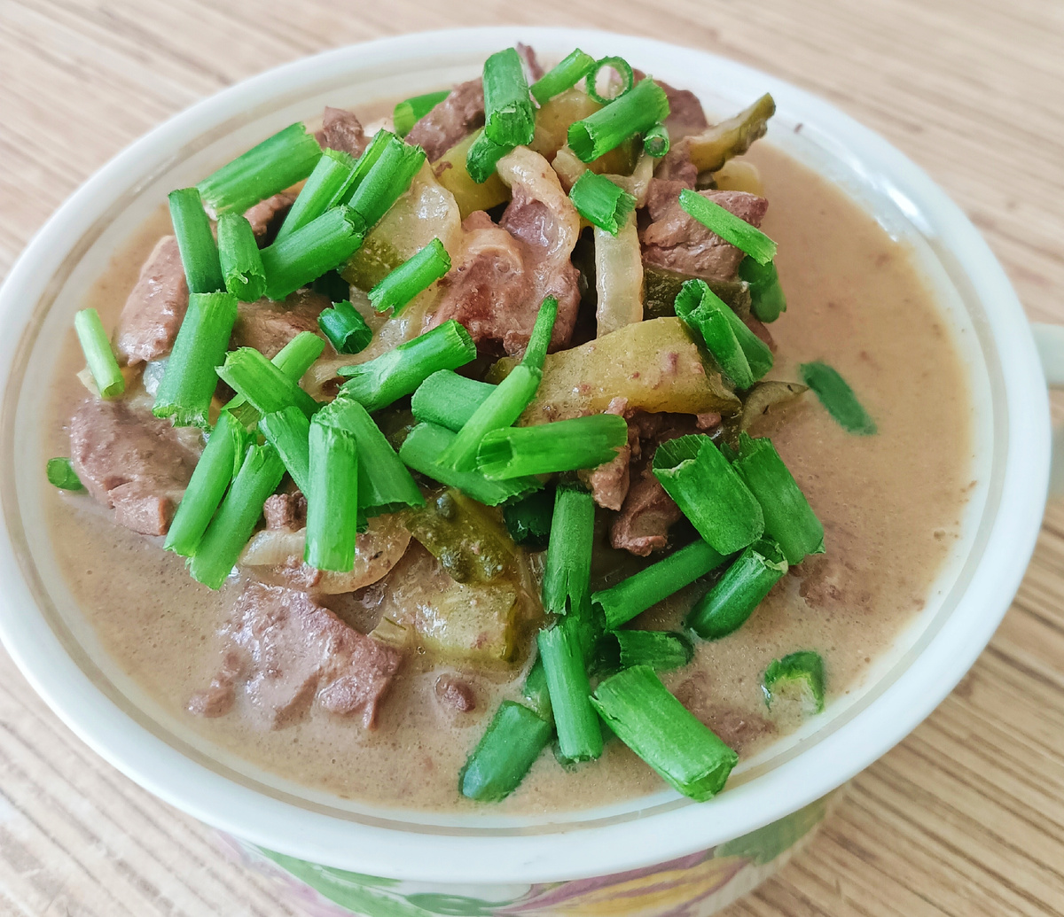Интереснейший рецепт из печени! Печень я люблю, и рецептов из нее знаю довольно много, но вот так готовить печень мне еще не доводилось! Интересно то, что добавление всего лишь одного ингредиента делает обычный "гуляш" из печени очень ярким, насыщенно вкусным блюдом! Я даже не ожидала такого эффекта! Итак, "секретный ингредиент" - это всего лишь маринованный огурец. Но до чего же замечательно он сочетается с печенью и сметаной! Нам потребуется : Печень(любая) 500г Лук (крупный) 1 шт Маринованный огурец 2-3 шт(в зависимости от размера) Мука 1 ст.л.(с горкой) Сметана 100г Соль, перец черный молотый Масло растительное 4-5 ст.л. Приготовление: Печень нарезаем помельче: кубиками или соломкой, как больше нравится . Лук нарезаем тонкими полукольцами или четвертинками колец. Огурцы нарезаем соломкой. Теперь все делается довольно быстро В сковороде разогреваем масло. Закладываем обжариваться лук. Когда лук станет золотистым, закладываем печень. Обжариваем печень с луком до исчезновения жидкос